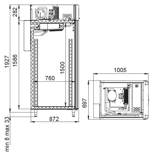 Каталог оборудования Холодильное оборудованиеШкафы холодильныеСпециализированные холодильные шкафыШкаф холодильный для вызревания салями Polair CS107 Salami черный, со стеклом Шкаф холодильный для вызревания салями Polair CS107 Salami черный, со стеклом Код товара: 062-632 Поделиться: WhatsAppTelegram СравнитьДобавить в КПВ избранное 0 373 915 ₽ В корзину 0 шт Под заказСамовывоз сегодня бесплатно Взять в кредит Купить в лизинг Получить консультацию в WhatsApp Описание Характеристики Отзывы 0 Инструкции 5 Шкаф холодильный для вызревания салями Polair CS107 Salami черный, со стеклом предназначен для приготовления и хранения салями, сыровяленых колбас и других мясных деликатесов на предприятиях общественного питания и торговли. Цельнозаливной монолитный корпус выполнен из нержавеющей стали снаружи и внутри (кроме задней стенки), что обеспечивает высокую прочность, долговечность и удобство ухода. Оборудование рассчитано на работу при температуре окружающей среды до +40 °С. Особенности: Динамическое охлаждение с мягким обдувом без заветривания Верхнее расположение агрегата Автоматическая оттайка с системой испарения конденсата Русифицированная многофункциональная панель управления с дисплеем диагональю 5" Возможность создания и сохранения индивидуальных программ Встроенный ультразвуковой увлажнитель (необходима подача очищенной воды и подключение к канализации) UV-лампа для обеззараживания воздуха внутри камеры Три уровня подвесов с тремя перекладинами и крюками на каждом уровне для удобной развески колбас Регулируемый уровень влажности: от 60 до 95 % Распашная дверь с заливной теплоизоляцией, встроенной ручкой и магнитным уплотнителем Отключаемая LED-подсветка камеры Штампованное углубление в дне корпуса для удобства ухода Педаль для удобного открытия двери Хладагент R290 (пропан) Толщина стенки корпуса: 43 мм Polair CS107 Salami черный, со стеклом — это профессиональный холодильный шкаф, идеально подходящий для цехов, гастробаров и мясных мастерских. Он обеспечивает оптимальные условия для дозревания и хранения деликатесов за счёт точного контроля температуры и влажности, продуманной конструкции и расширенного функционала. Такой шкаф помогает сохранять качество и вкус продукции на высоком уровне.Изображение товара, представленного на фото, может отличаться от его фактического вида. Показать все Габаритные размеры697×1005×1960 ммДиапазон рабочей температурыот -2 до +30 °CДлина697 ммШирина1005 ммВысота1960 ммОбъём700 лКол-во дверей1 Тип двериСтеклянная Уровень влажностиот 60 до 95 %Холодильный агрегатВстроенный Тип оттайкиАвтоматическая Тип охлажденияДинамическое ПодсветкаЕсть UV-лампаЕсть ХладагентR290 Вес нетто160 кгВес брутто190 кгБрендPolairВсе специализированные холодильные шкафы Из нержавейкиВсе специализированные холодильные шкафы Стеклянная дверь Оставить отзыв Еще никто не оставил отзыв на этот товар Схема POLAIR CS107 Salami.jpgИнструкция на POLAIR CS107 Salami.pdfБрошюра на POLAIR CS107 Salami.pdfДекларация о соответствии.pdfСертификат соответствия.pdf Похожие товары Перейти в каталог Под заказ 252 314 ₽ Шкаф холодильный для вызревания мяса и сыра Carboma M700GN-1-G-MHC 9005 Под заказ 389 300 ₽ Шкаф холодильный для вызревания сыра Polair CS107 Cheese черный, со стеклом Под заказ 389 300 ₽ Шкаф холодильный для вызревания мяса Polair CS107 Meat (Тип 1) Под заказ 419 900 ₽ Шкаф холодильный для хлебопекарных производств Polair CS107-Bakery Br со