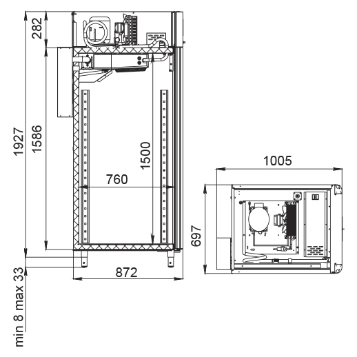 Каталог оборудования Холодильное оборудованиеШкафы холодильныеСпециализированные холодильные шкафыШкаф холодильный для вызревания салями Polair CS107 Salami со стеклом Шкаф холодильный для вызревания салями Polair CS107 Salami со стеклом Код товара: 062-631 Поделиться: WhatsAppTelegram СравнитьДобавить в КПВ избранное 0 385 050 ₽ В корзину 0 шт Под заказСамовывоз сегодня бесплатно Взять в кредит Купить в лизинг Получить консультацию в WhatsApp Описание Характеристики Отзывы 0 Инструкции 5 Шкаф холодильный для вызревания салями Polair CS107 Salami со стеклом предназначен для приготовления и хранения салями, сыровяленых колбас и других мясных деликатесов на предприятиях общественного питания и торговли. Корпус цельнозаливной конструкции выполнен из нержавеющей стали снаружи и внутри (кроме задней стенки), что обеспечивает высокую прочность и долговечность. Дверь выполнена в виде стеклопакета для удобного визуального контроля. Оборудование рассчитано на работу при температуре окружающей среды до +40 °С. Особенности: Динамическое охлаждение с мягким обдувом без заветривания Верхнее расположение агрегата Автоматическая оттайка с системой испарения конденсата Русифицированная многофункциональная панель управления с дисплеем 5" и возможностью создания и сохранения собственных программ Встроенный ультразвуковой увлажнитель (необходима подача очищенной воды и подключение к канализации) UV-лампа для обеззараживания воздуха внутри камеры 3 пары направляющих с тремя перекладинами и подвесами для колбас Регулируемый уровень влажности: от 60 до 95 % Распашная дверь с заливной теплоизоляцией, встроенной ручкой и магнитным уплотнителем Отключаемая внутренняя LED-подсветка Штампованное углубление в дне корпуса для удобства ухода Педаль для удобного открытия двери Хладагент R290 (пропан) Толщина стенки корпуса: 43 мм Polair CS107 Salami со стеклом — это профессиональный шкаф, разработанный специально для мясных деликатесов. Он обеспечивает оптимальные условия для ферментации и хранения продукции за счёт точного контроля температуры и влажности, продуманной конструкции и удобного функционала. Такой шкаф станет надёжным решением для мясных цехов, гастробаров и специализированных магазинов.Изображение товара, представленного на фото, может отличаться от его фактического вида. Показать все Габаритные размеры697×1005×1960 ммДиапазон рабочей температурыот -2 до +30 °CДлина697 ммШирина1005 ммВысота1960 ммОбъём700 лКол-во дверей1 Тип двериСтеклянная Уровень влажностиот 60 до 95 %Холодильный агрегатВстроенный Тип оттайкиАвтоматическая Тип охлажденияДинамическое ПодсветкаЕсть UV-лампаЕсть ХладагентR290 Вес нетто160 кгВес брутто190 кгБрендPolairВсе специализированные холодильные шкафы Из нержавейкиВсе специализированные холодильные шкафы Стеклянная дверь Оставить отзыв Еще никто не оставил отзыв на этот товар Схема POLAIR CS107 Salami.jpgИнструкция на POLAIR CS107 Salami.pdfБрошюра на POLAIR CS107 Salami.pdfДекларация о соответствии.pdfСертификат соответствия.pdf Похожие товары Перейти в каталог Под заказ 399 500 ₽ Шкаф холодильный для вызревания мяса Polair CS107 Meat со стеклом (Тип 1) Под заказ 389 300 ₽ Шкаф холодильный для вызревания сыра Polair CS107 Cheese черный, со стеклом Под заказ 385 050 ₽ Шкаф холодильный для вызревания салями Polair CS107 Salami со стеклом Под заказ 169 915 ₽ Шкаф холодильный для хлебопекарных производств Polair CS107 Bakery Bs В наличии 18