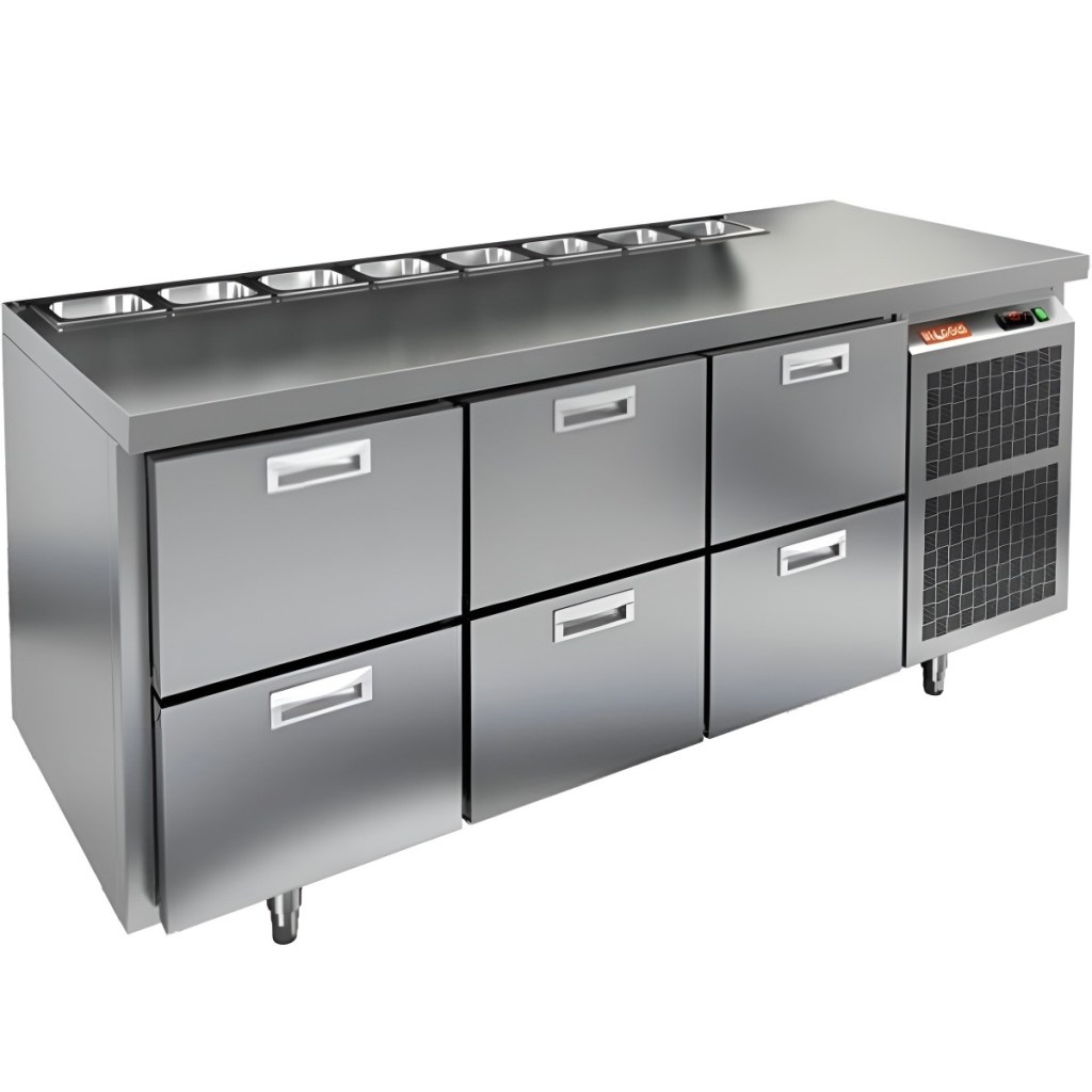 Каталог оборудования Холодильное оборудованиеСтолы охлаждаемыеСтолы холодильные для салатовСтол холодильный для салатов HiCold SL1-222GN (1/3) О без крышки Стол холодильный для салатов HiCold SL1-222GN (1/3) О без крышки Код товара: 064-850 Поделиться: WhatsAppTelegram СравнитьДобавить в КПВ избранное 0 255 412 ₽ В корзину 0 шт Под заказСамовывоз сегодня бесплатно Взять в кредит Купить в лизинг Получить консультацию в WhatsApp Описание Характеристики Отзывы 0 Стол холодильный для салатов HiCold SL1-222GN (1/3) О без крышки предназначен для использования на предприятиях общественного питания и торговли. Он объединяет рабочую поверхность и охлаждаемый отсек, что делает его удобным решением для хранения, охлаждения и подготовки ингредиентов при приготовлении салатов, пиццы и других блюд. Такая конструкция позволяет повару работать быстрее и эффективнее, так как все необходимые продукты находятся под рукой. Корпус и столешница выполнены из прочной нержавеющей стали, устойчивой к коррозии и легко поддающейся санитарной обработке. Особенности модели: Электронная панель управления — точная настройка температурного режима. 9 выдвижных ящика — быстрое размещение и замена продуктов. Вместимость салат-бара — до 8 гастроемкостей глубиной до 100 мм. Автоматические доводчики — комфорт при загрузке/выгрузке. Легкозаменяемые магнитные уплотнители — надежная герметичность. Открытая агрегатная часть — быстрый доступ для обслуживания. Регулируемые по высоте ножки — устойчивость даже на неровном полу. Толщина столешницы, и теплоизоляции — 50 мм, что обеспечивает прочность и энергоэффективность конструкции. HiCold SL1-222GN (1/3) О без крышки — практичное и удобное решение для профессиональной кухни, обеспечивающее удобную подготовку и хранение ингредиентов. Изображение товара, представленного на фото, может отличаться от его фактического вида. Показать все Габаритные размеры1835×700×850 ммДиапазон рабочей температурыот +2 до +10 °CРасположение агрегатаБоковое Материал столешницыНержавеющая Тип столаС ящиками Объём505 лТип гастроемкостейGN 1/3 Количество ящиков6 штНапряжение220 ВМощность0,46 кВтТип охлажденияДинамическое Тип оттайкиАвтоматическая СтолешницаБез борта Габариты в упаковке2000×850×1000 ммВес нетто130 кгВес брутто185 кгБрендHicold Оставить отзыв Еще никто не оставил отзыв на этот товар Ранее просмотрено Под заказ 143 721 ₽ Стол холодильный для салатов HiCold SL1-11GN (1/3) О с крышкой Под заказ 133 282 ₽ Стол холодильный для салатов HiCold SLE3-11GN полипропилен, без крышки Под заказ 139 671 ₽ Стол холодильный для салатов HiCold SL1-11SN (1/3) О без крышки Под заказ 162 270 ₽ Витрина холодильная Carboma GC110 VV 2,0-1 (ВХСр-2,0 Carboma CG 110 (динамика)) (1005 венге) Под заказ 127 791 ₽ Стол холодильный для салатов HiCold SLE1-11GN (1/3) О З с крышкой Под заказ 100 700 ₽ Витрина кондитерская Carboma KC70 N 0,6-1 Light Bread Паттерн (0106 Седой дуб) хлебная, со стеклом Под заказ 187 290 ₽ Горка холодильная Carboma FC20-07 VM 0,7-1 LIGHT фронт Х0 (версия 2.0) (9006-9005)