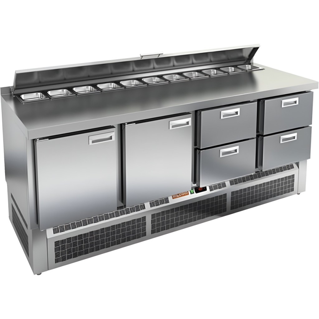 Стол холодильный для салатов HiCold SLE2-1122GN (1/6) с крышкой — это профессиональный салатный стол, предназначенный для использования в кафе, ресторанах, пиццериях и других предприятиях общественного питания. Он совмещает в себе просторную рабочую поверхность и охлаждаемый объем, обеспечивая удобство и эффективность при приготовлении различных блюд — от салатов до пиццы.
