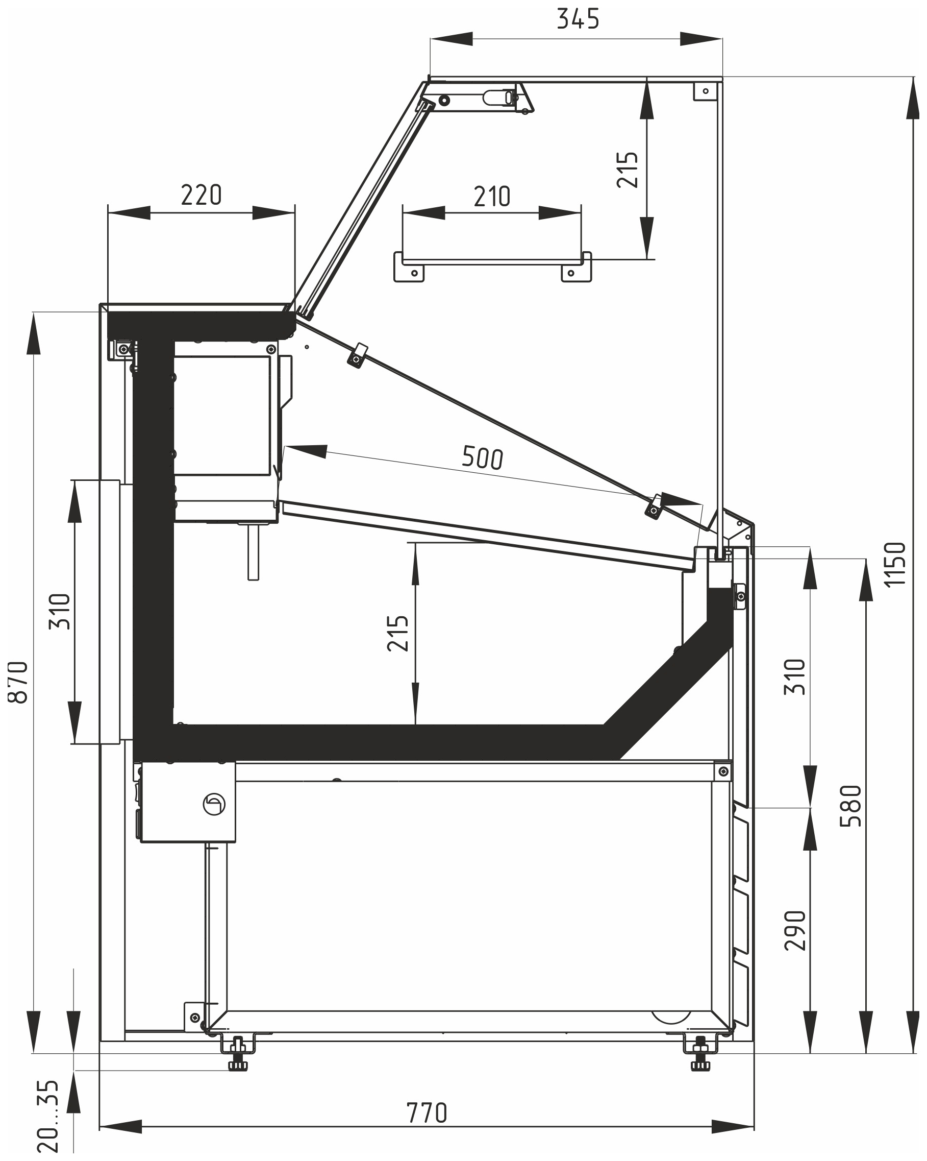 Конструкция витрины включает накопитель для продуктов, поддон для выкладки и регулируемые ножки высотой 20–35 мм. Столешница, зона выкладки, боковые и нижняя фронтальная панели, а также обшивка светильника и испарителя выполнены из стали серебристого цвета. Декоративная передняя панель — из стали, держатель стекла — из нержавеющей стали. Боковины и столешница имеют пенополиуретановую теплоизоляцию.