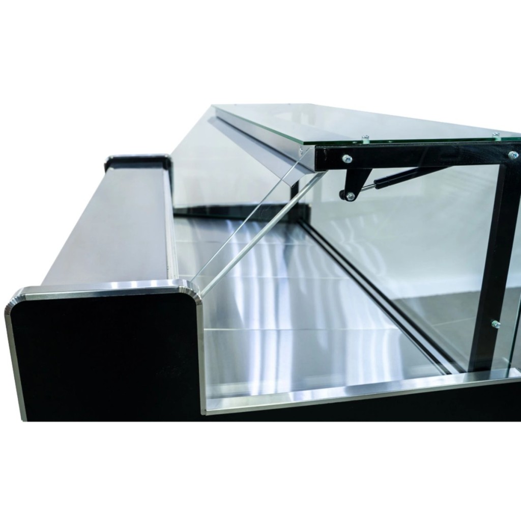 Ровное расположение витрины обеспечивается регулируемыми опорами, что гарантирует правильный сбор конденсата и тихую работу оборудования. Внутреннее LED-освещение ярко подсвечивает продукцию, потребляет минимум энергии и практически не нагревает воздух внутри камеры.