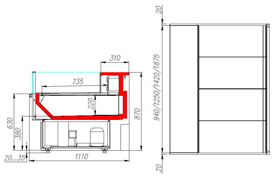 Отдельностоящие витрины приобретаются только с боковинами. При установке в линию нескольких моделей с одинаковым температурным режимом достаточно двух боковин на всю линию. Передняя панель может быть выполнена из окрашенной стали, нержавеющей стали или МДФ — в зависимости от предпочтений клиента.